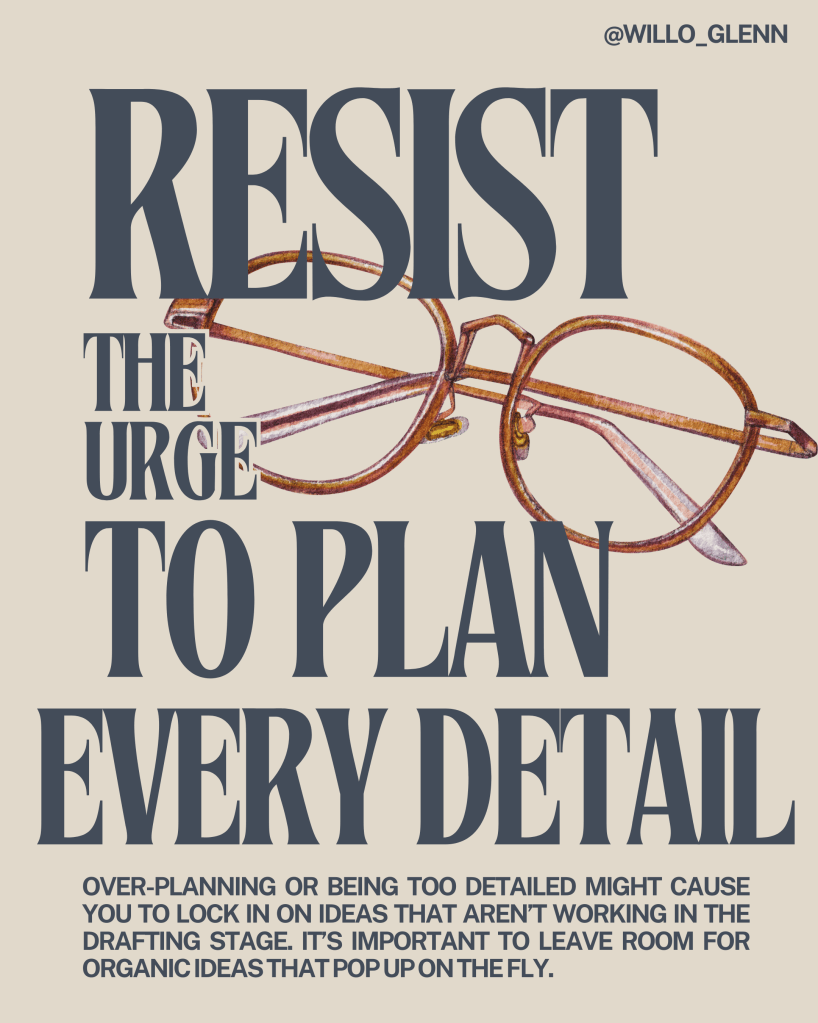 You must, must, must resist the urge to plan every detail. Over-planning is the killer of creativity. If you plan too much, or are too detailed in your outline, you may cause yourself to lock in on ideas that just aren’t working during the actual drafting stage. It’s important to leave room for organic ideas that pop up on the fly and might work better.